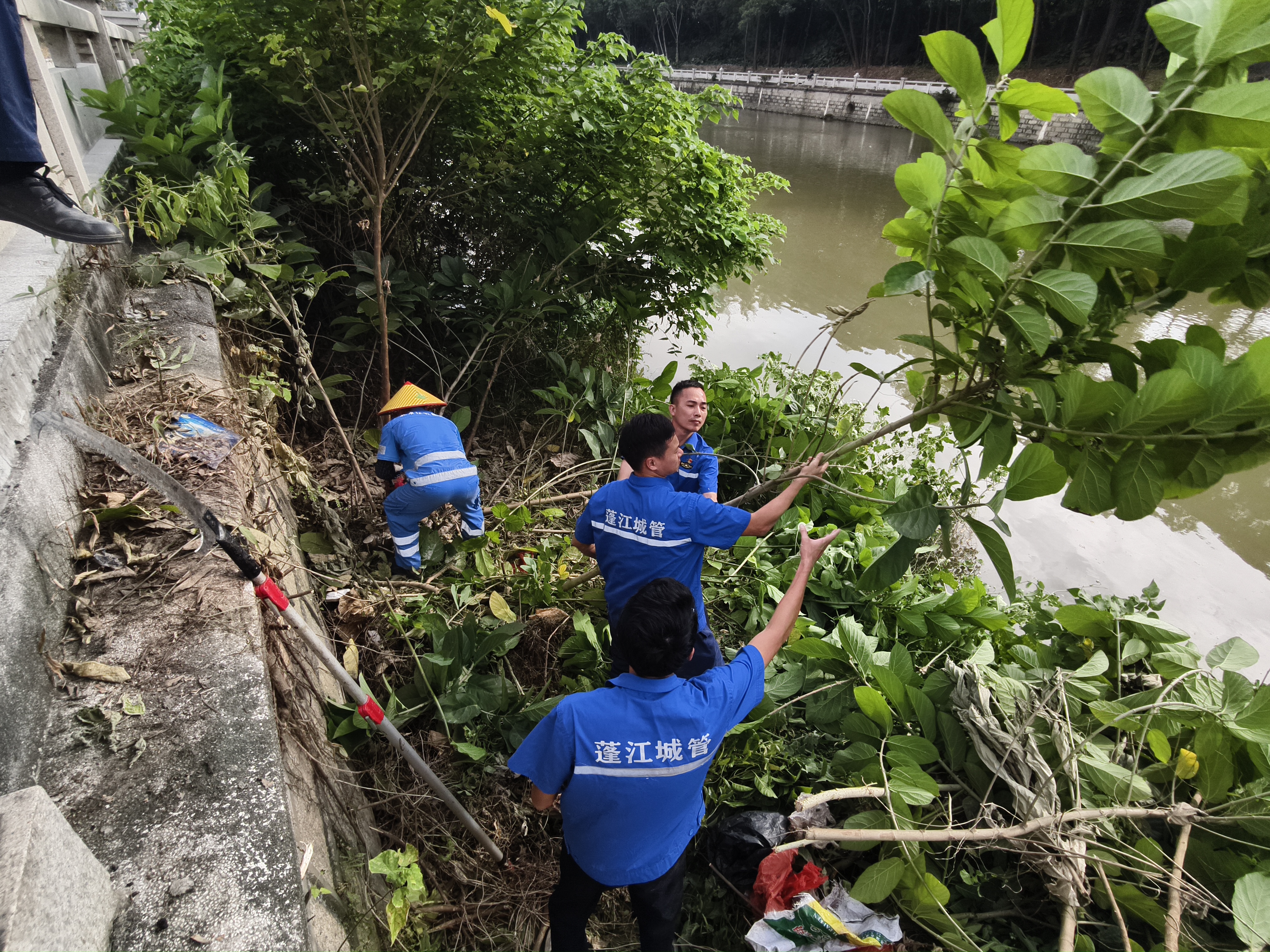 針對巡查發(fā)現(xiàn)天沙河兩岸(華盛路至江咀碼頭)河堤和江門河北岸(江北路至江咀碼頭)河堤垂直面雜樹雜草生長繁茂,根系延伸進(jìn)護(hù)欄及堤岸,易導(dǎo)致護(hù)欄及堤岸松動(dòng)、開裂,樹枝茂盛阻塞河道排洪,影響水質(zhì)環(huán)境和防洪安全。為此,蓬江區(qū)城市管理和綜合執(zhí)法局主動(dòng)聯(lián)合區(qū)農(nóng)業(yè)農(nóng)村和水利局、江門京環(huán)公司開展清理河道樹障專項(xiàng)行動(dòng),對沿河兩岸過度生長的雜樹以及雜樹根莖進(jìn)行徹底清除、清理。目前已完成1.2千米河堤岸的雜草雜樹清理。