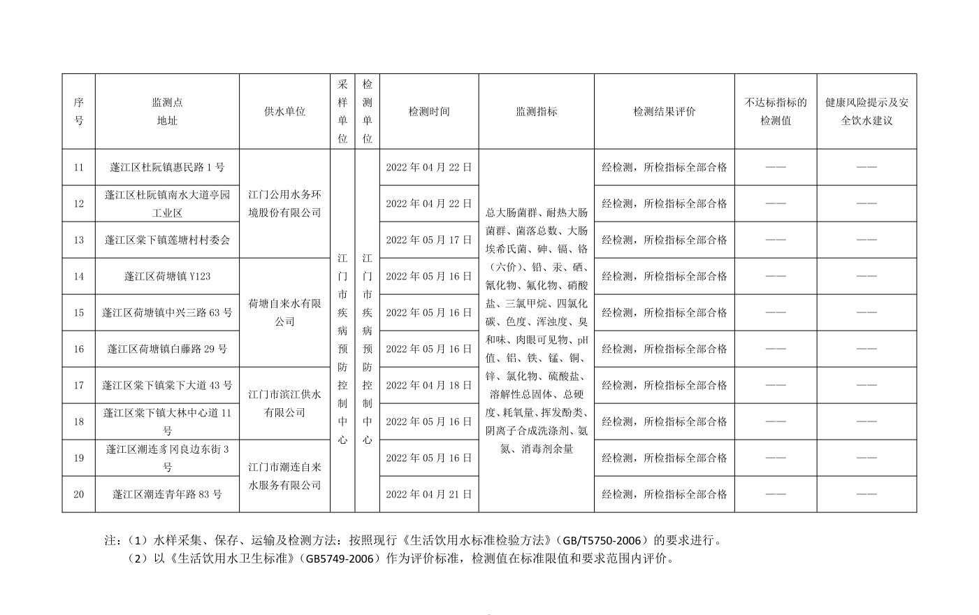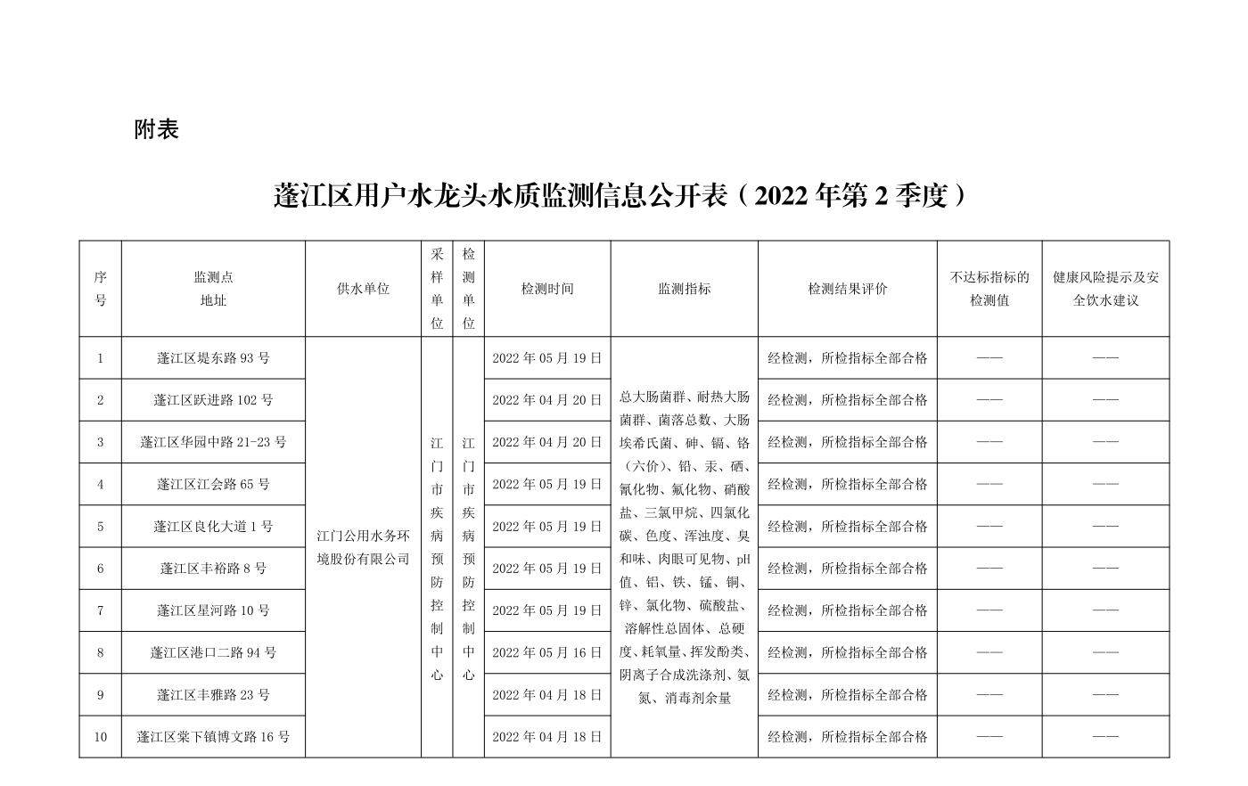 蓬江區(qū)用戶水龍頭水質(zhì)監(jiān)測信息公開表(2022年第2季度)