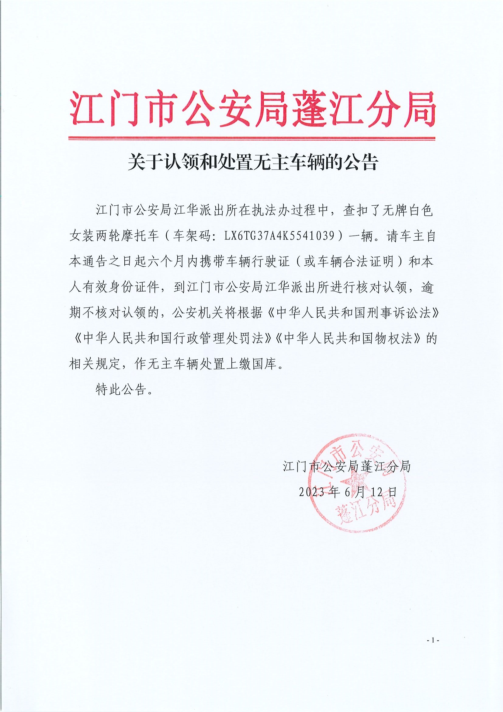 江門市公安局江華派出所在執(zhí)法辦過程中,查扣了無牌白色女裝兩輪摩托車(車架碼:LX6TG37A4K5541039)一輛。請車主自本通告之日起六個月內攜帶車輛行駛證(或車輛合法證明)和本人有效身份證件,到江門市公安局江華派出所進行核對認領,逾期不核對認領的,公安機關將根據(jù)《中華人民共和國刑事訴訟法》《中華人民共和國行政管理處罰法》《中華人民共和國物權法》的相關規(guī)定,作無主車輛處置上繳國庫。