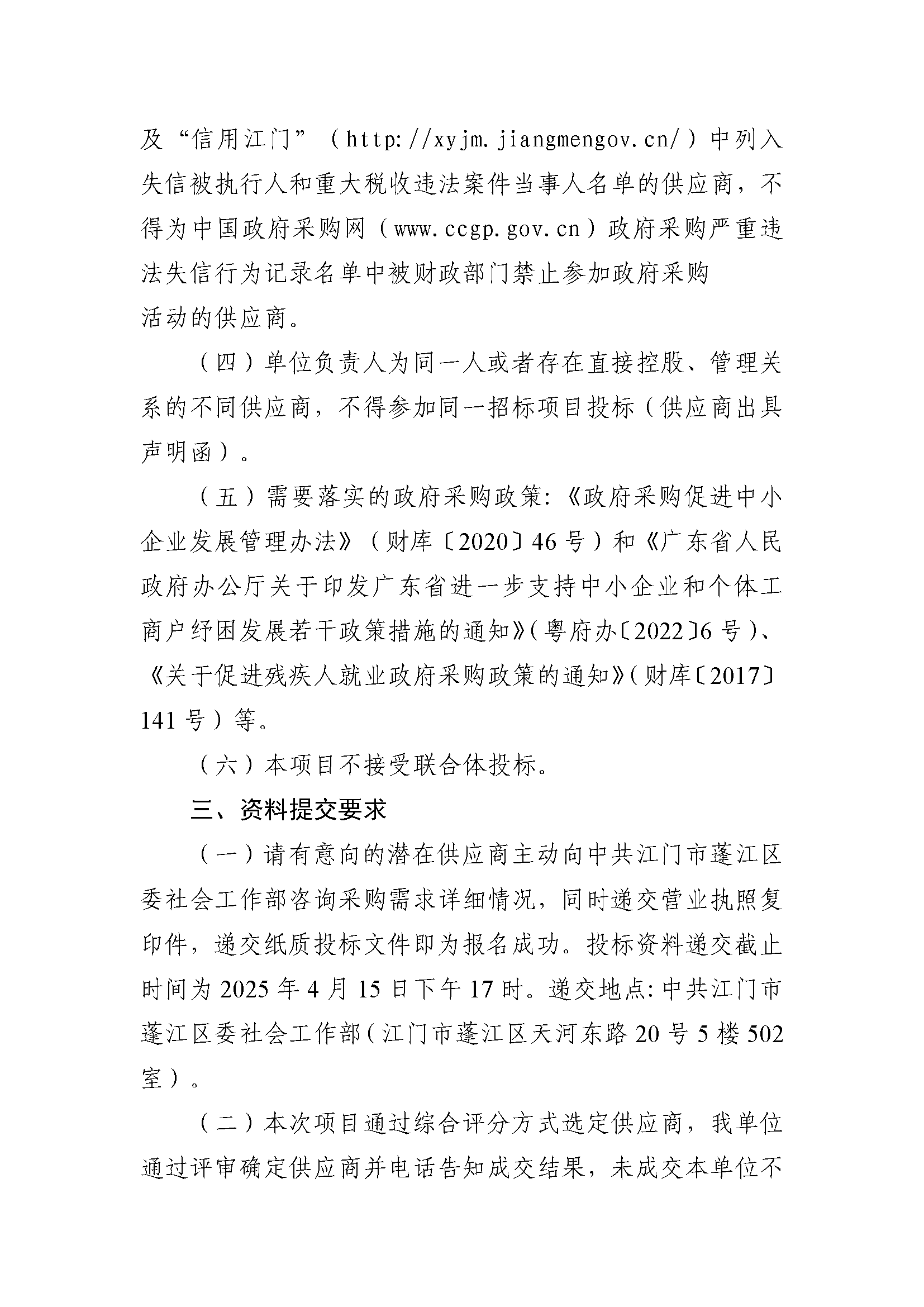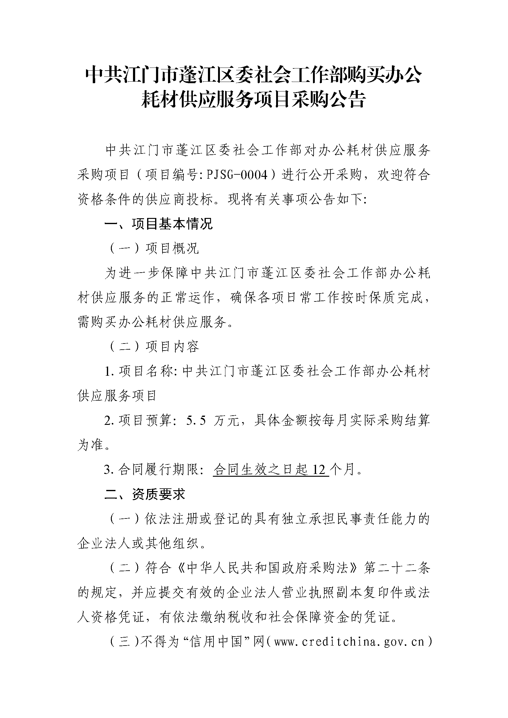 中共江門市蓬江區(qū)委社會(huì)工作部購買辦公耗材供應(yīng)服務(wù)項(xiàng)目采購公告