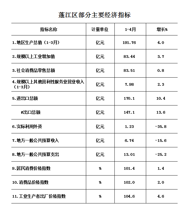 1-4月,蓬江區(qū)主要經(jīng)濟(jì)指標(biāo)增長(zhǎng)總體平穩(wěn),但經(jīng)濟(jì)發(fā)展存在較多不確定因素。