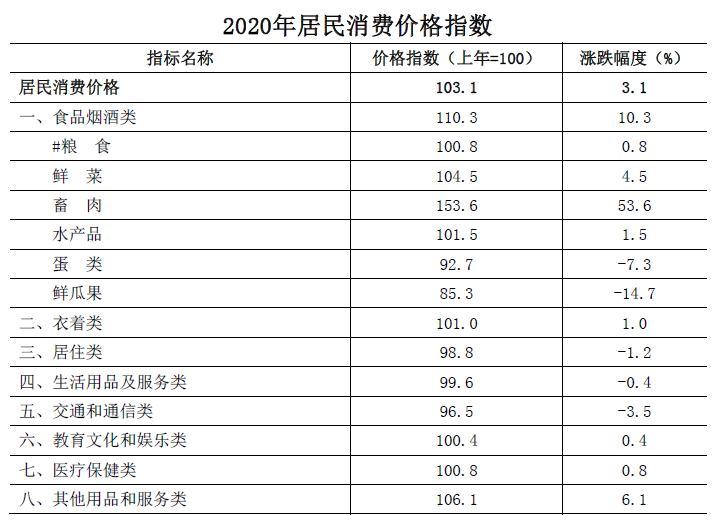 全年居民消費(fèi)價(jià)格比上年上漲3.1%。分類別看,食品煙酒類價(jià)格上漲10.3%,衣著類價(jià)格上漲1.0%,居住類價(jià)格下降1.2%,生活用品及服務(wù)類價(jià)格下降0.4%,交通和通信類價(jià)格下降3.5%,教育文化和娛樂類價(jià)格上漲0.4%,醫(yī)療保健類價(jià)格上漲0.8%,其他用品和服務(wù)類價(jià)格上漲6.1%。工業(yè)生產(chǎn)者出廠價(jià)格下降1.3%,商品零售價(jià)格上漲1.7%。