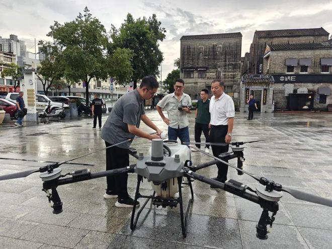 一架載著蚊蟲(chóng)消殺藥水的無(wú)人機(jī)先后在長(zhǎng)堤歷史文化文化街區(qū)青年廣場(chǎng)和啟明里廣場(chǎng)起飛,該無(wú)人機(jī)搭載智能?chē)姙⑾到y(tǒng),容量達(dá)70L,可自動(dòng)調(diào)整飛行高度與控制噴藥量,達(dá)到精準(zhǔn)噴灑的效果。
