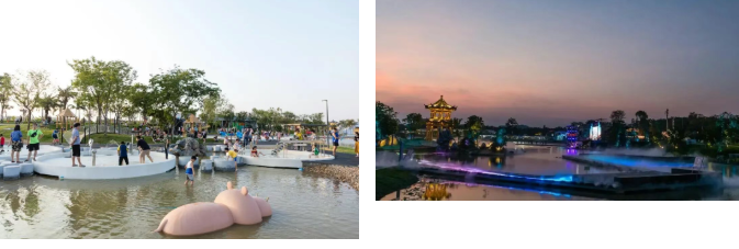 若是在傍晚時分到訪,公園便換上了另一副迷人面孔——亭臺樓閣、小橋流水,在精心設(shè)計(jì)的燈光映照下倒映湖面,勾勒出一幅“燈影波光兩相宜”的絕美畫卷。