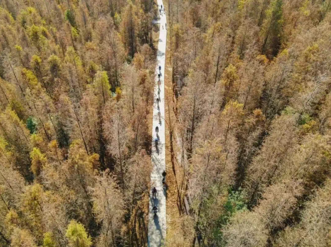 接下來可前往特成沙公園,探尋冬日限定的落羽杉奇觀。這片約12萬平方米的落羽杉林,擁有超過5萬棵落羽杉。每逢冬季,紅、橙、黃三色交織,彩葉斑斕,宛如童話世界,是攝影愛好者的絕佳取景地。