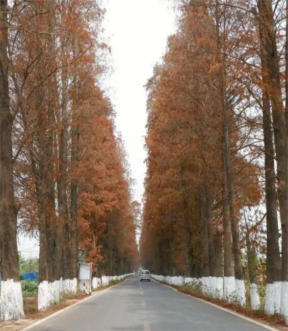 沿著Y166鄉(xiāng)道駛?cè)霕废?,最先迎接您的是公坑寺前那排排挺拔的落羽杉。它們已悄然換上紅裝,在冬日暖陽下,勾勒出一條絕美的紅色廊道?!?/span>